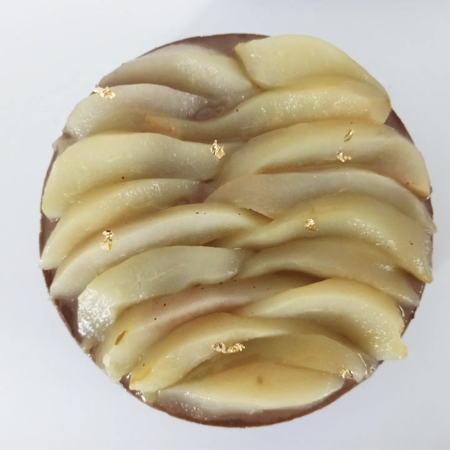 Pâte sucrée cacao, crème d’amande cacao, crémeux chocolat & poires au sirop.