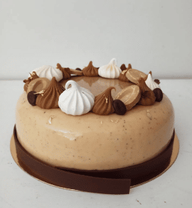 Biscuit madeleine, croustillant praliné, crème namelaka café, ganache montée vanille café, glaçage café.