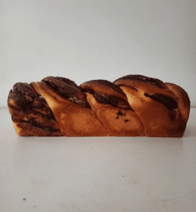 Brioche tressée garnie de pâte à tartiner et d'éclats de noisettes.
